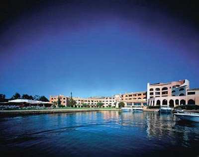 Perched above the Costa Smeralda, the unique turquoise coastline of Sardinia, the hotel has wonderful views of distant mountains, white sand beaches, and the translucent seas of the Mediterranean. Designed by architect Jacques Couelle to resemble an old village, the hotel's towers, terraces, irregular roofs and porticoes blend with the natural landscape. From October 18, 2004 to April 22, 2005, the resort is closed for the winter season.